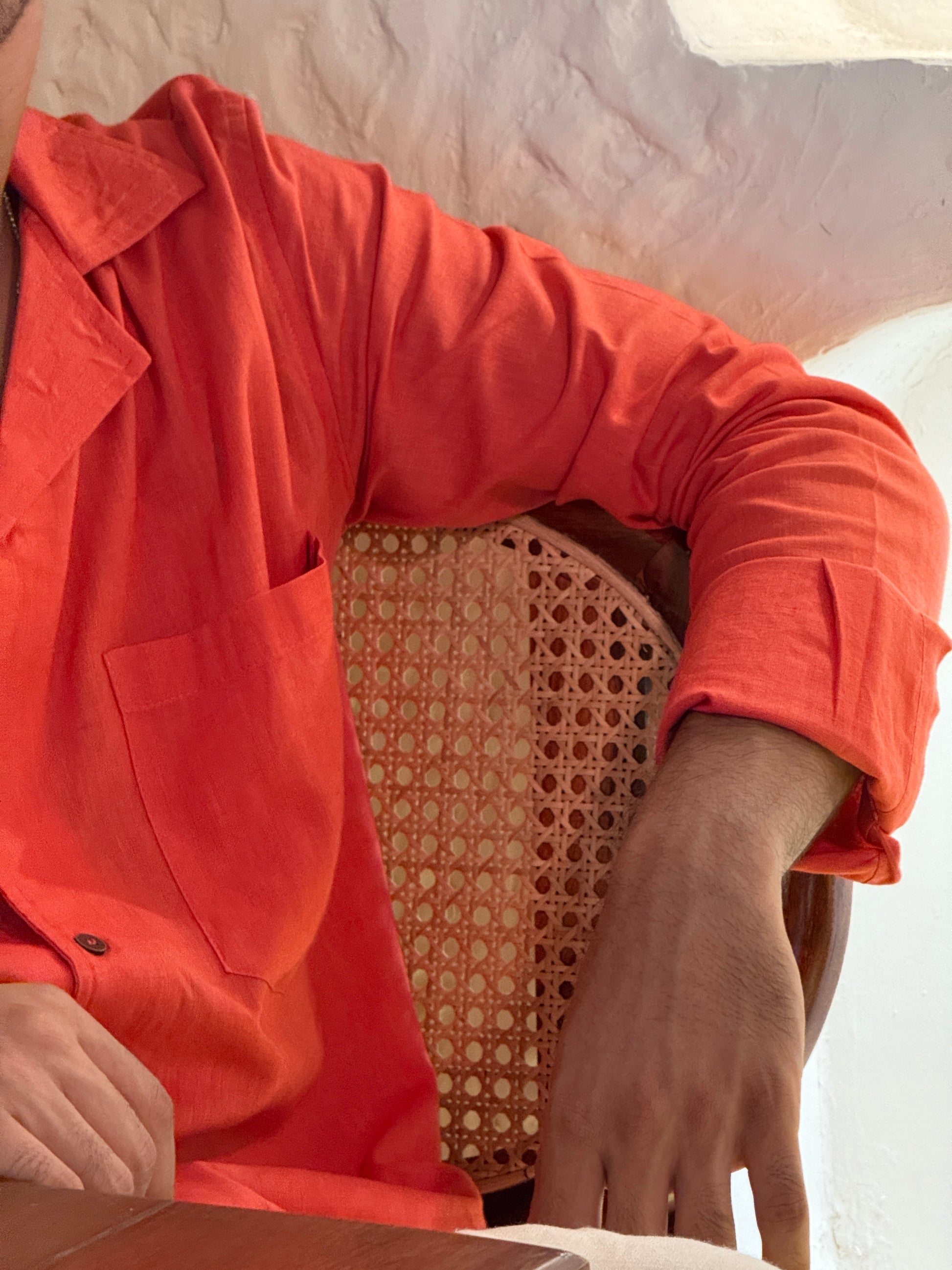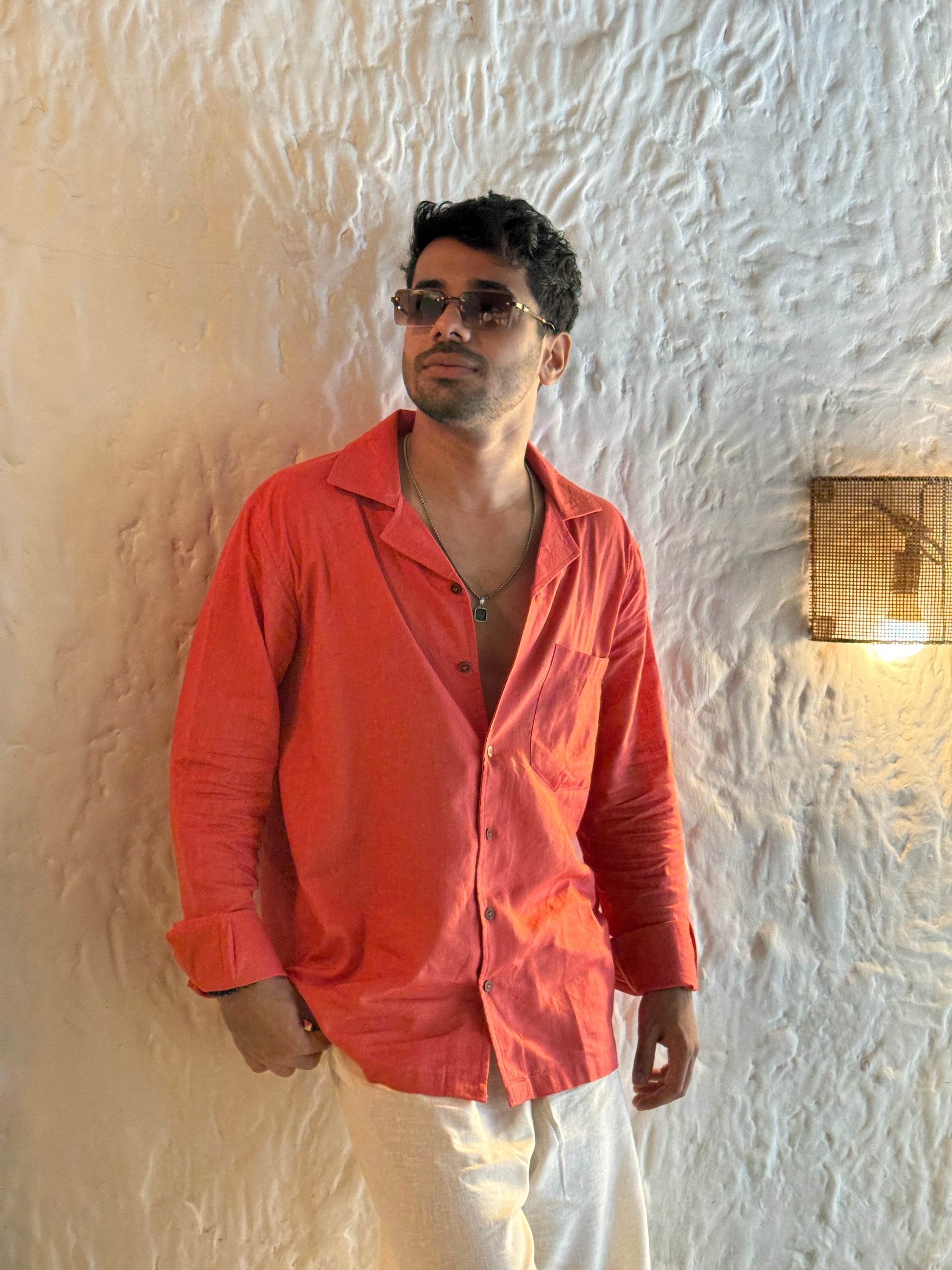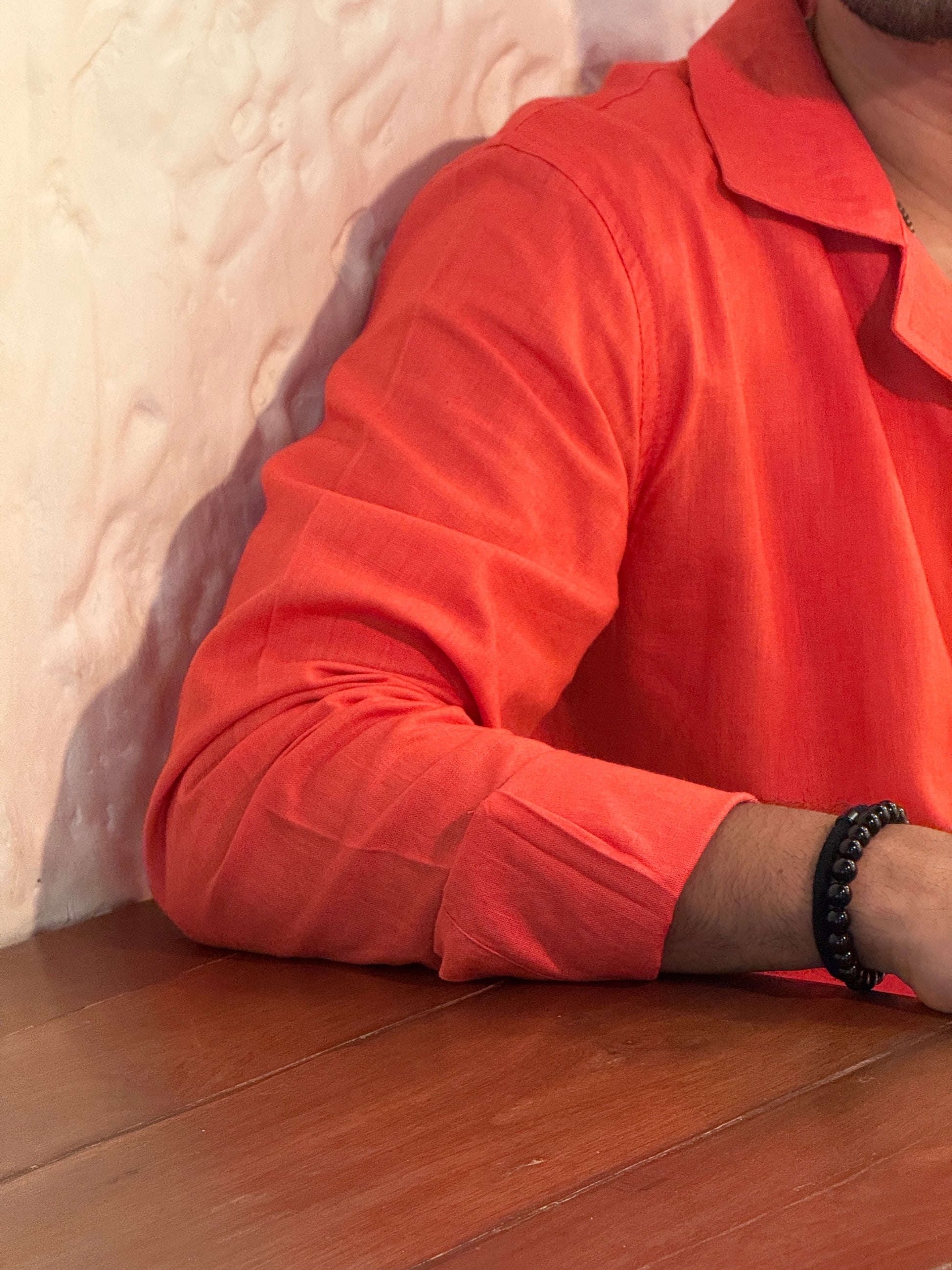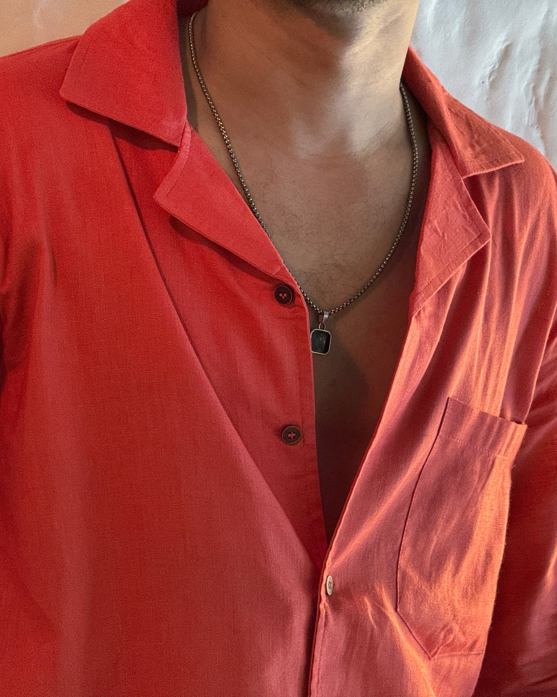 Cotton-Linen Cuban Collar Shirt – in Scarlett Red Color.